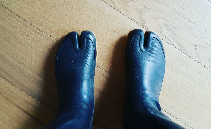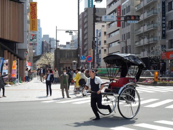 Nell’area fumatori di fianco ai bagni noto un jinrikisha, il risciò giapponese. Il ragazzo che lo traina ha gambe da calciatore e indossa ai suoi piedi delle tabi nere. Le calzature con le dita.