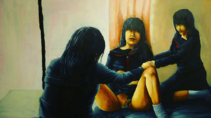 Questa volta c’è una ragazzina molto giovane che espone i suoi quadri. Parla con le sue amiche e con una improbabile insegnante.