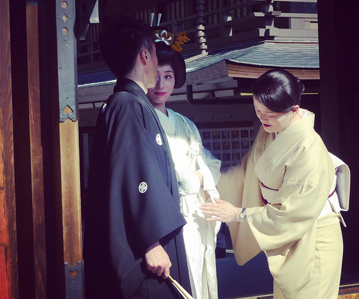 La sposa era assediata dai parenti, dalla madre che continuava a metterle a posto il kimono e ovviamente da me, che facevo finta di essere la comara venuta da lontano.