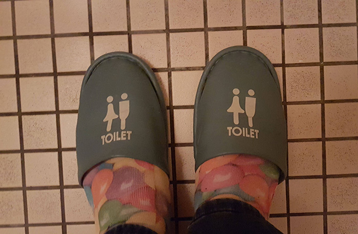 Ad accoglierci un Godzilla nanetto e delle ciabatte terribili. Io non ho mai capito come mai il Giappone, così attento all’estetica e alla bellezza possa produrre questi obbrobri.