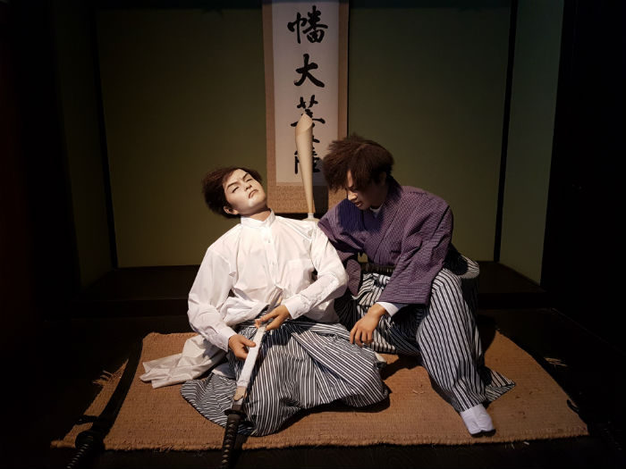 Fra katane e statue di guerrieri è anche esposta un po’ di paranoia. Si vede che ce l’hanno per vizio ad Aizu di istigarti al suicidio Guardate questo manichino: È la riproduzione di un samurai quindicenne che si uccide in nome del suo padrone.