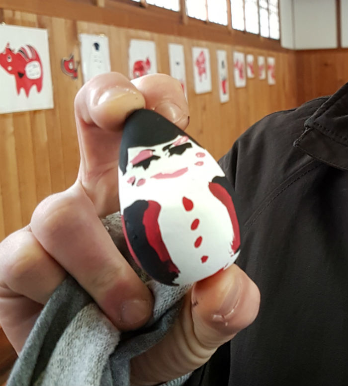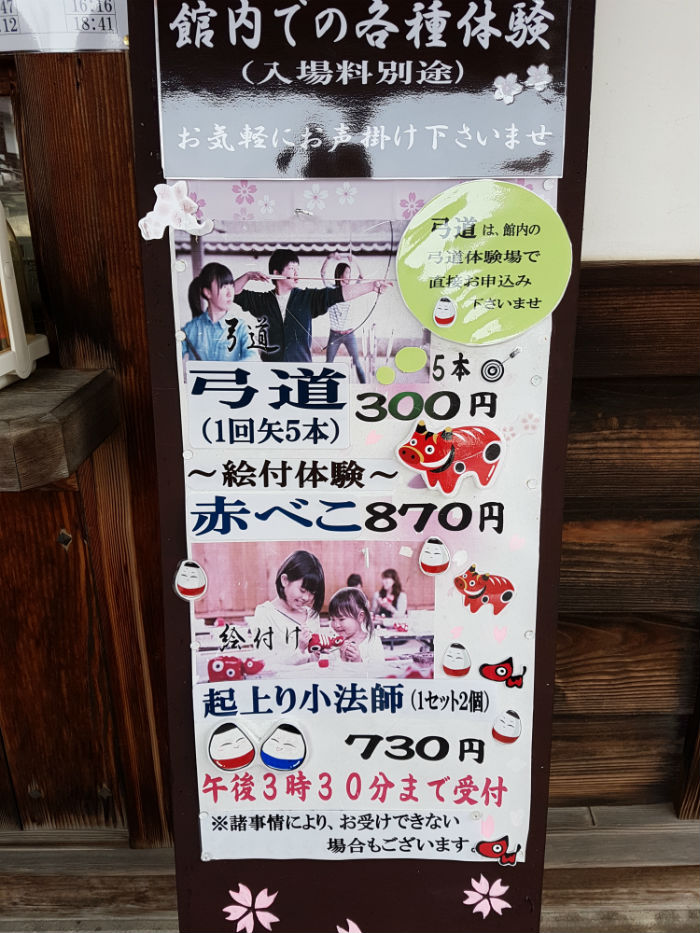 Dentro la scuola si possono fare anche due esperienze: tiro con l’arco per soli 300 Yen o lavoretto delle medie: ovvero pitturare la mucca rossa Akabeko o l’ovetto Koboshi.